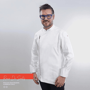 Casaco de manga comprida unissexo GASTROCHEF com gola de camisa, fecho central com botões de pressão ocultos e bolso esquerdo na manga. Modelo semi-ajustado.